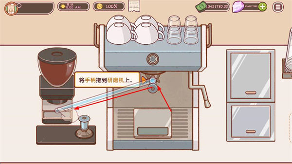1、按照提示將手柄拖到研磨機(jī)上,完成咖啡豆研磨的準(zhǔn)備步驟。