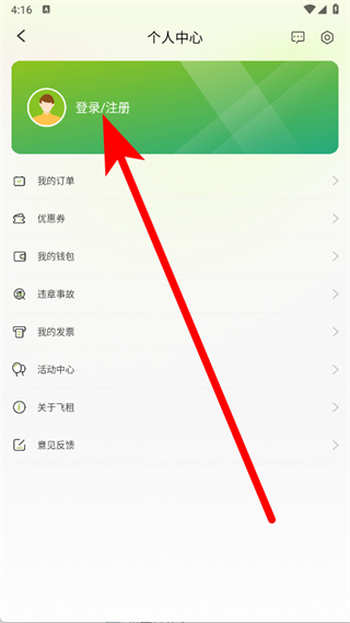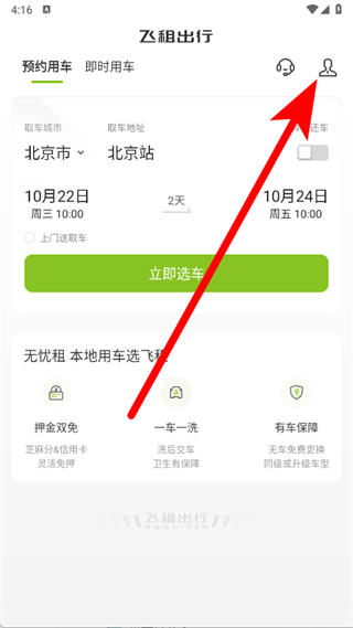 1、打開飛租出行,點擊首頁右上角的個人中心圖標。