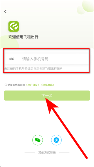 3、在登錄頁面,輸入手機號碼,勾選同意后,點擊下一步。