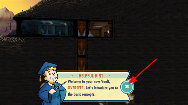 1、點擊提示框中的OK按鈕,關(guān)閉歡迎提示,正式進入避難所建設(shè)流程。這是熟悉游戲基本概念的起始操作。
