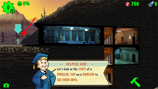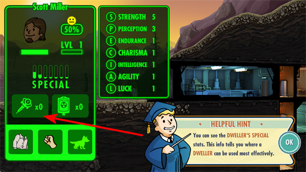 1、點(diǎn)擊避難所外的居民,查看其屬性面板。居民的SPECIAL屬性決定了其在不同房間的工作效率,通過(guò)查看可合理分配崗位。