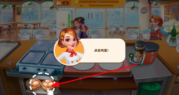 2、玩家操作點(diǎn)擊雞蛋籃等食材區(qū)域,獲取新鮮食材,為烹飪美味佳肴做好充分準(zhǔn)備。