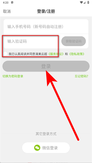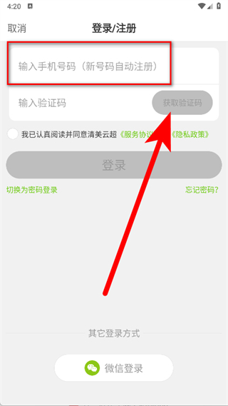 3、進入登錄注冊頁面后,輸入手機號碼,點擊獲取驗證碼。