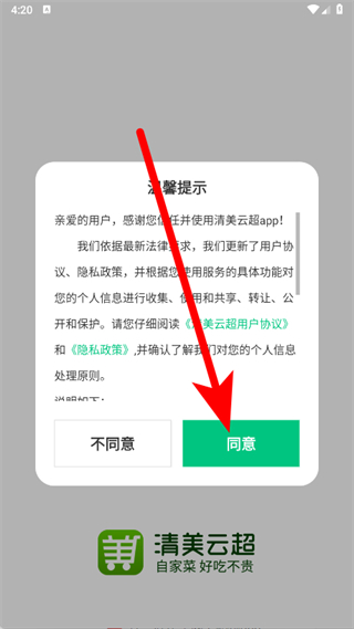 1、打開清美云超團購配送,在彈出的溫馨提示頁面,點擊同意。