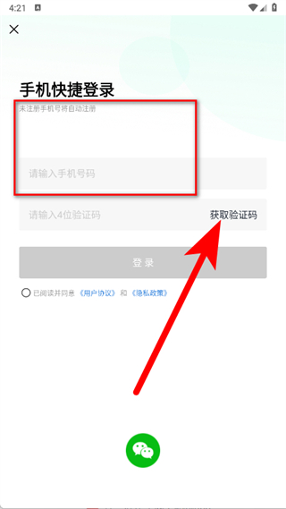 3、在手機(jī)快捷登錄頁(yè)面,輸入手機(jī)號(hào)碼,點(diǎn)擊獲取驗(yàn)證碼。