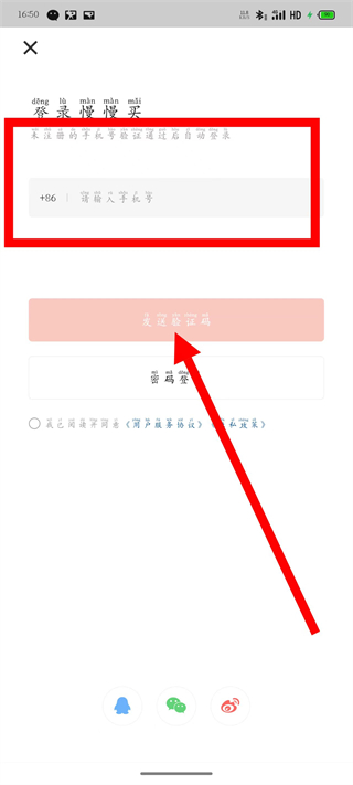 3、在登錄頁面,輸入手機號碼,點擊發(fā)送驗證碼。