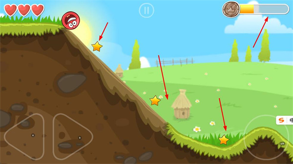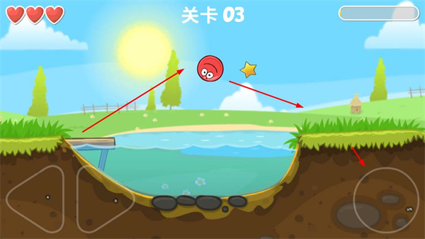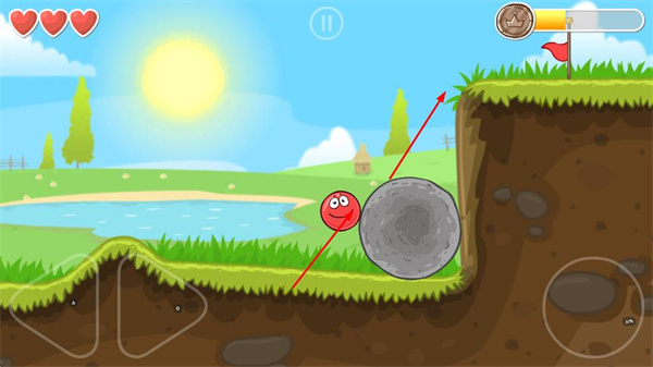 1、在不同關(guān)卡中操控紅球移動,跨越水域等地形障礙,朝著目標前進。