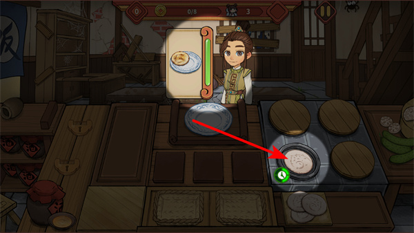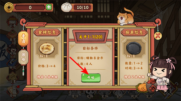3、點(diǎn)擊關(guān)卡界面的開始按鈕,進(jìn)入關(guān)卡1-1,需賺取8金幣,服務(wù)4位客人,通過烹飪燒餅等食物達(dá)成目標(biāo)。