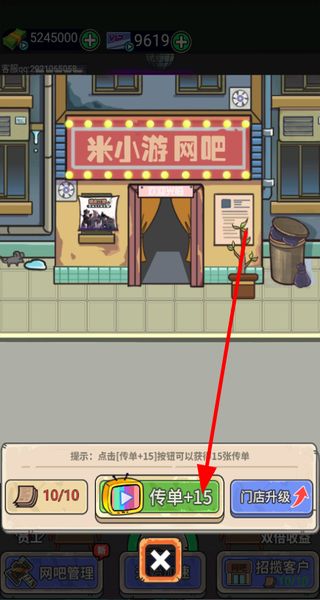 3、在推廣界面點擊傳單加15按鈕獲取傳單,通過發(fā)放傳單招攬周邊客戶,有效增加網吧的日??土髁?,穩(wěn)步提升經營收益。