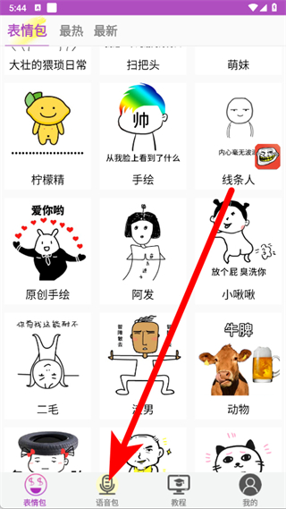1、打開(kāi)斗圖表情包大全,點(diǎn)擊底部導(dǎo)航欄的語(yǔ)音包選項(xiàng)。
