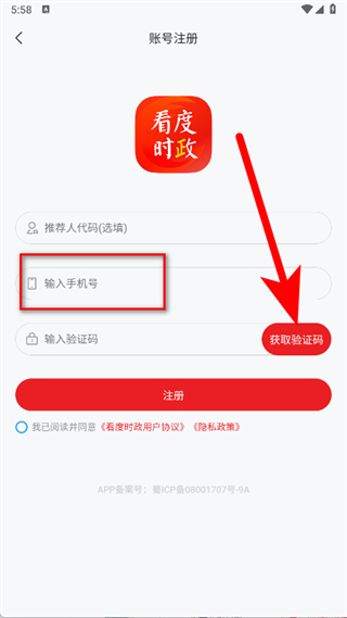 3、在賬號注冊頁面,輸入手機號碼,點擊獲取驗證碼。