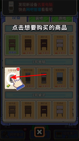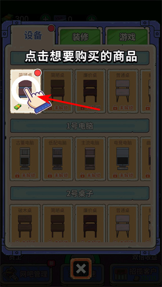 1、在設(shè)備列表中點(diǎn)擊想要購買的商品如桌子、電腦,消耗資源升級網(wǎng)吧硬件設(shè)施,提升網(wǎng)吧的吸引力。
