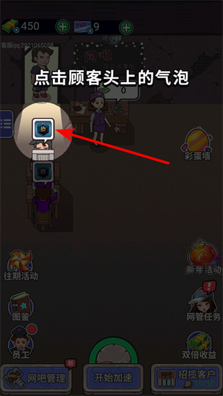 2、點(diǎn)擊顧客頭上的氣泡,與顧客互動了解需求或完成服務(wù),提升顧客滿意度,增加網(wǎng)吧的經(jīng)營收益。