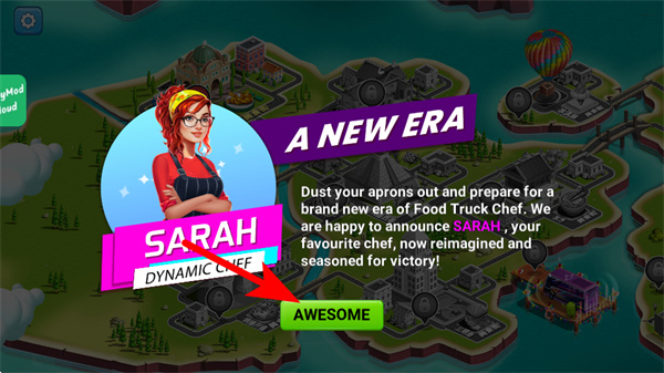 1、點(diǎn)擊AWESOME按鈕,確認(rèn)游戲更新信息,開啟新的游戲紀(jì)元,體驗廚師Sarah的全新經(jīng)營之旅。