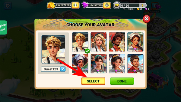 2、在角色選擇界面點(diǎn)擊SELECT按鈕,選定游戲avatar,個性化你的廚師形象,開啟餐車經(jīng)營生涯。