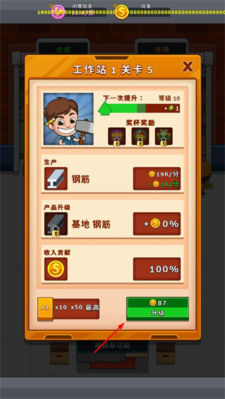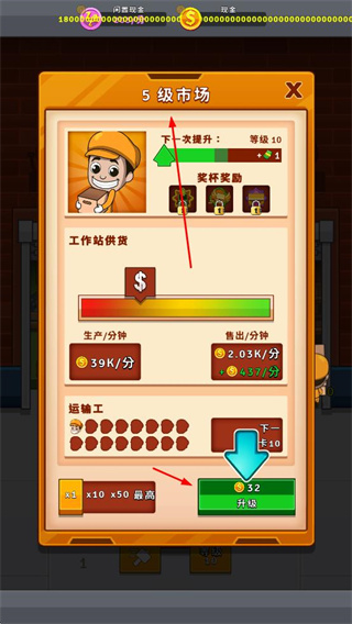 升級(jí)體系覆蓋工作站、機(jī)器、產(chǎn)品三大核心,每次升級(jí)都能直觀提升生產(chǎn)效率或產(chǎn)品質(zhì)量,升級(jí)所需金幣隨等級(jí)合理增長(zhǎng),既保證成長(zhǎng)感,也讓玩家有明確的經(jīng)營(yíng)目標(biāo)可追求。