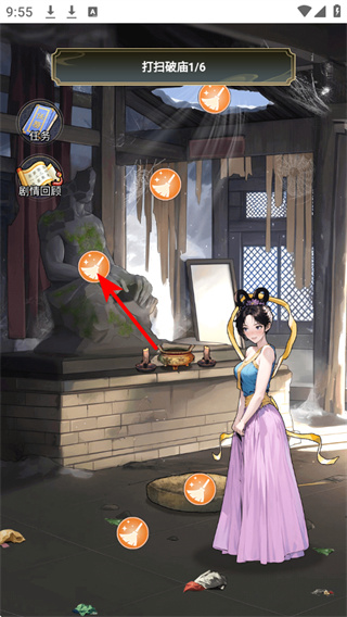 2、按照提示點(diǎn)擊對應(yīng)區(qū)域,完成打掃破廟的任務(wù),逐步清理寺廟環(huán)境,提升經(jīng)營條件。