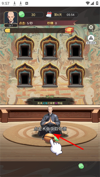 4、點(diǎn)擊木魚進(jìn)行敲動(dòng),積累功德,通過敲擊提升敲擊速度與功德獲取效率,助力發(fā)展。