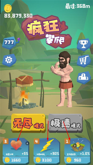 2、在主界面,選擇無(wú)盡模式或極速模式開(kāi)啟游戲,也可花費(fèi)金幣提升屬性,為攀爬助力。