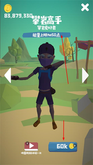 3、花費(fèi)金幣解鎖不同角色,提升能量上限等屬性,增強(qiáng)攀爬能力。