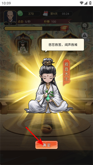2、點確定按鈕,確認觀音大士的解鎖或相關(guān)劇情,獲取功德等資源,助力寺廟發(fā)展。