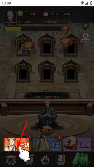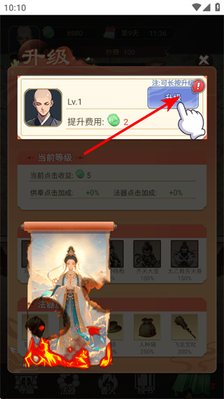 3、點擊升級按鈕,消耗資源提升角色等級,增加點擊收益與各項加成,強化寺廟的經(jīng)營能力。