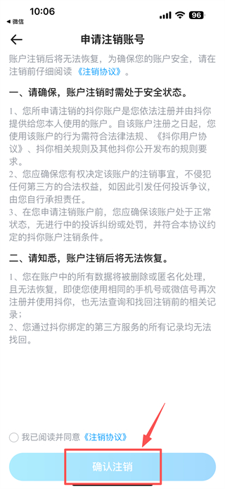 4、閱讀注銷協(xié)議后,點(diǎn)擊確認(rèn)注銷按鈕,完成賬號(hào)注銷操作。