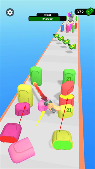 1、操控劍切割彩色物體,積累分?jǐn)?shù),同時(shí)留意生命值,保障闖關(guān)續(xù)航能力。