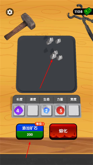 3、在鍛造界面,花費(fèi)金幣添加礦石,選擇熔化,提升劍的長(zhǎng)度、速度等各項(xiàng)屬性,增強(qiáng)劍的實(shí)力。