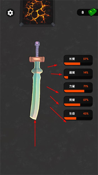 4、在屬性界面,查看劍的長(zhǎng)度、速度、力量、寬度、生命等屬性,了解劍的戰(zhàn)力情況,為闖關(guān)和鍛造提供參考。