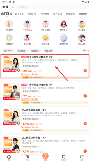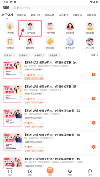 2、在商城頁面,點(diǎn)擊中青年優(yōu)選分類,瀏覽該分類下的體檢套餐。