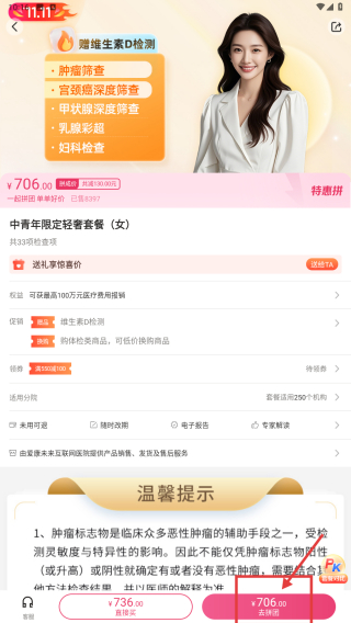 4、在套餐詳情頁,點(diǎn)擊去購買按鈕,完成體檢套餐的選購操作。