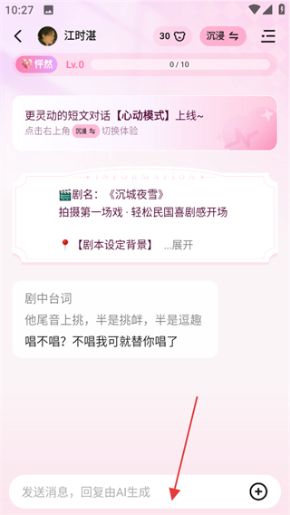 3、在聊天界面,可在輸入框發(fā)送消息回復(fù)由AI生成中輸入內(nèi)容與角色互動。