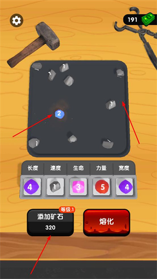 2、在鍛造界面,花費(fèi)金幣添加礦石,點(diǎn)擊熔化,提升劍的長(zhǎng)度、速度等屬性,增強(qiáng)劍的實(shí)力。