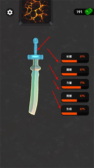 3、在屬性界面,查看劍的長(zhǎng)度、速度、力量、寬度、生命等屬性,了解劍的戰(zhàn)力情況。