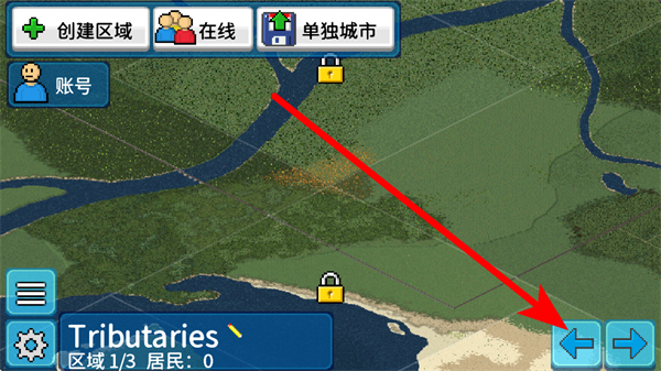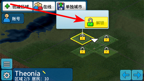 1、進(jìn)入游戲后,若區(qū)域處于鎖定狀態(tài),需滿足一定條件后點(diǎn)擊解鎖按鈕,解鎖新區(qū)域,以便拓展城市建造空間。