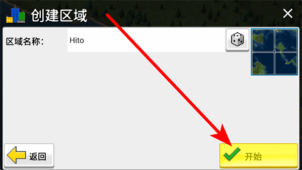 3、在創(chuàng)建區(qū)域界面,可設(shè)置區(qū)域名稱,也可點(diǎn)擊骰子圖標(biāo)更換地形,確認(rèn)后點(diǎn)擊開始按鈕,完成區(qū)域創(chuàng)建。