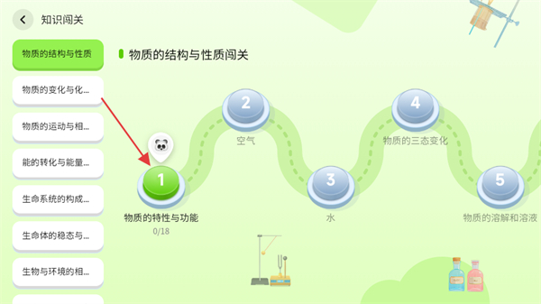 2、在知識(shí)闖關(guān)板塊,點(diǎn)擊1物質(zhì)的特性與功能可進(jìn)入對(duì)應(yīng)闖關(guān)內(nèi)容頁面。