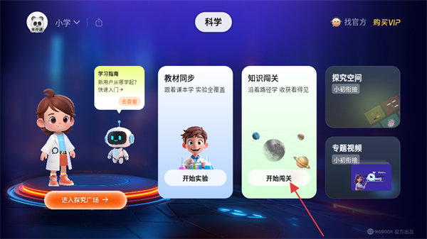 1、在nb實(shí)驗(yàn)室首頁,點(diǎn)擊開始闖關(guān)可進(jìn)入知識(shí)闖關(guān)板塊。