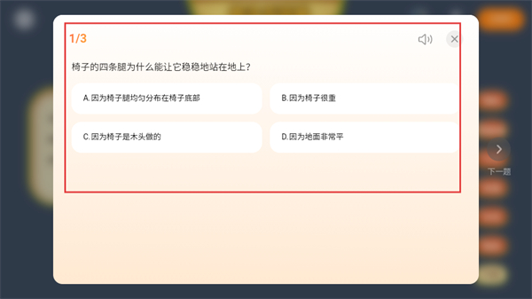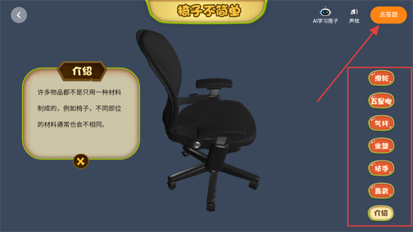 4、在知識(shí)點(diǎn)頁面學(xué)習(xí)椅子的各個(gè)零件的知識(shí),學(xué)習(xí)完后點(diǎn)擊去答題可進(jìn)入答題環(huán)節(jié)。