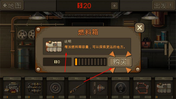 1、在車庫界面,花費(fèi)金錢購買燃料箱,增加燃料箱容量,以便探索更遠(yuǎn)的地方。
