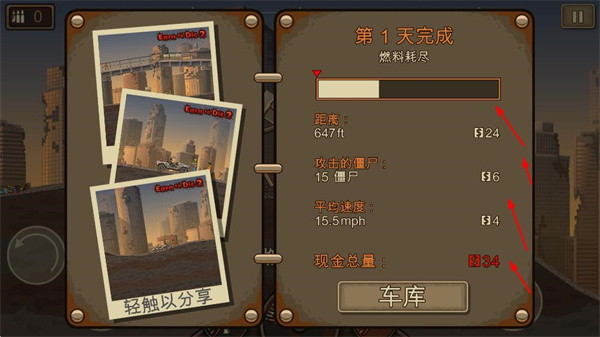 3、每天駕駛結(jié)束后,查看行駛距離、攻擊僵尸數(shù)量、現(xiàn)金總量等數(shù)據(jù),總結(jié)當(dāng)日成果。