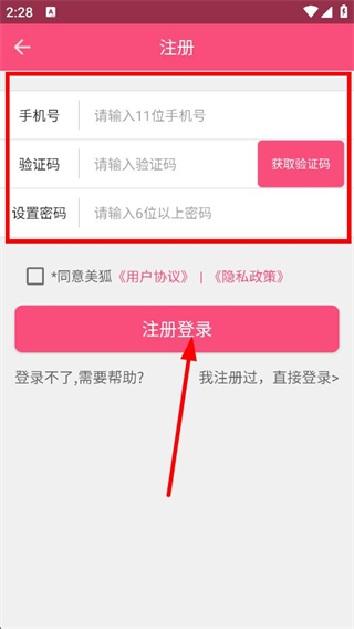 3、輸入手機號、驗證碼、設置密碼,點擊注冊登錄,完成賬號注冊。