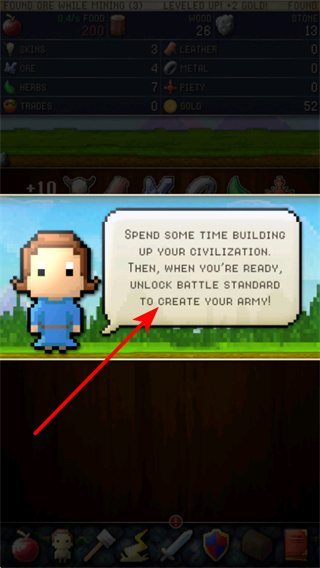 2、按照提示發(fā)展文明,積累資源、建造建筑、提升科技,待文明發(fā)展到一定程度后,解鎖創(chuàng)建軍隊,開展戰(zhàn)斗。