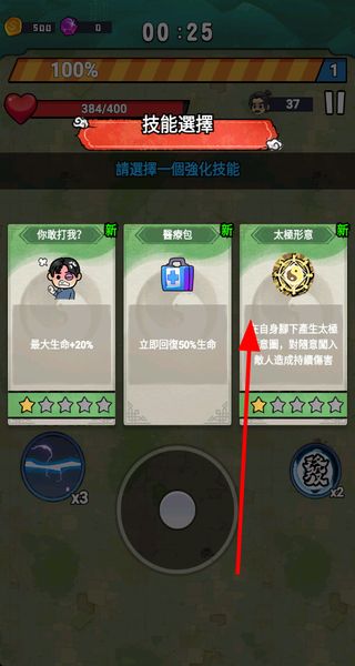2、戰(zhàn)斗過程中會出現(xiàn)技能選擇界面,精心挑選合適的強化技能,大幅提升自身戰(zhàn)力,更高效地消滅大量敵人。