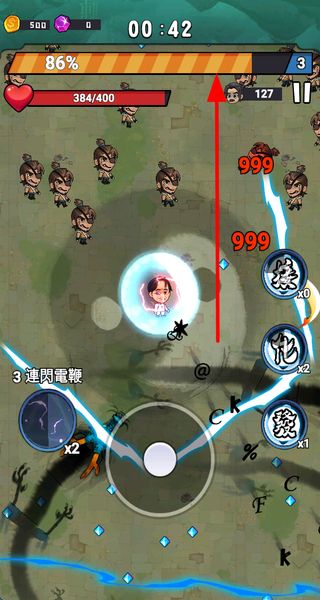 1、在充滿敵人的場景中使用技能攻擊敵人,消滅敵人可快速積累進度,顯著提升關(guān)卡完成度,獲取豐厚獎勵。