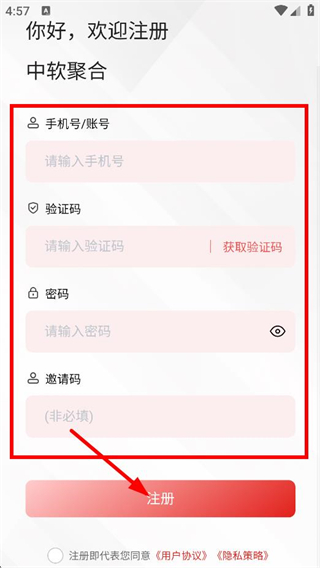 4、輸入手機(jī)號/賬號、驗(yàn)證碼、密碼,點(diǎn)擊注冊,完成賬號注冊。