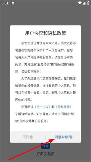 1、在用戶協(xié)議和隱私政策中,點擊同意繼續(xù),進入登錄頁面。