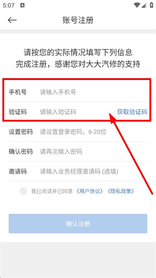 3、在賬號注冊頁面,輸入手機號,點擊獲取驗證碼,輸入驗證碼。