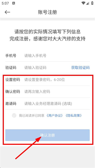 4、在賬號注冊頁面,設(shè)置密碼、確認(rèn)密碼,點擊確認(rèn)注冊,完成賬號注冊。